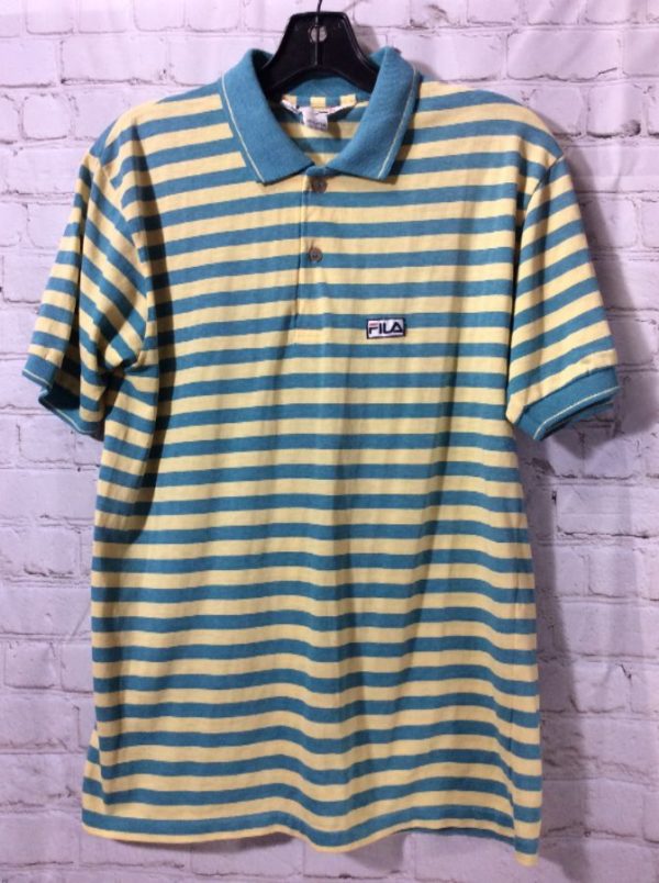 RETRO FILA SHIRT, COTTON, 2 BUTTONS ON NECK, COLLARED, HORIZONTAL STRIPE DESIGN, SOLID COLOR COLLAR AND SLEEVE TRIM, EMBROIDERED LEFT CHEST LOGO, BLUE/YELLOW, SIZE L