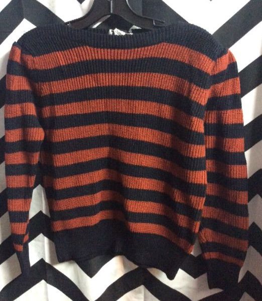 Retro pullover sweater, chunky knit, horizontal stripes, rust/black, size L