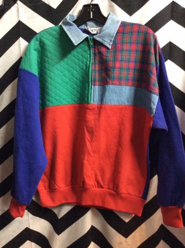 RETRO DENIM PULLOVER SWEATSHIRT W/COLLAR & PLAID PATCHWORK