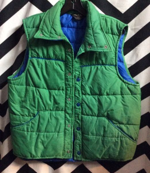 Retro vest, quilted, snap-up, two toned, green outside, blue inside, size M