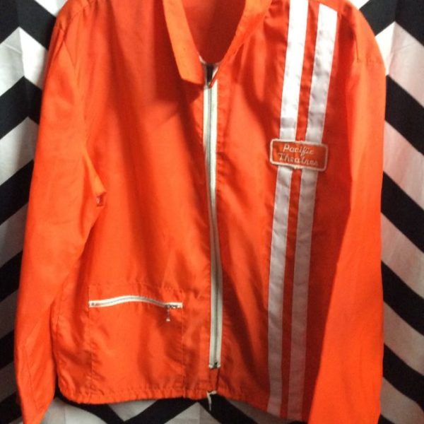 Retro racing windbreaker jacket, zip-up, stripe down front, stripe across back, Pacific Theaters embroidered patch, orange/white, size L