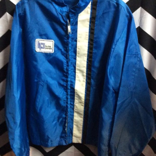 Retro windbreaker jacket, racing style, zip-up, stripe down front, Burks Pumps patch, blue/black/white, size L