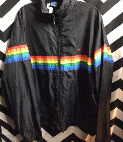 Retro OP windbreaker jacket, zip-up, hooded, horizontal rainbow stripe design, black/multi, size XL