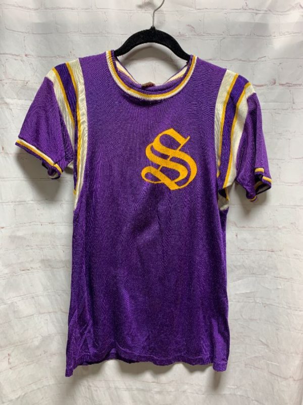 Retro Mason football jersey, pullover, ringed neck & sleeves, shoulder stripes, screen printed front S in Old English font & #9 on back, purple/white/yellow, size S As is small fit