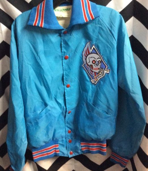 Retro baseball style jacket, satin, button-up, cigarette smoking skull patch, striped trim, light blue/red/white, size S