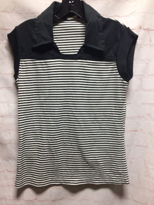 RETRO SPORTY TOP, POLO STYLE, PULLOVER, SLEEVELESS, COLLARED, VERTICAL PINSTRIPED DESIGN, CONTRASTING SLEEVE TRIM/SHOULDERS/COLLAR, BLACK/WHITE, SIZE S