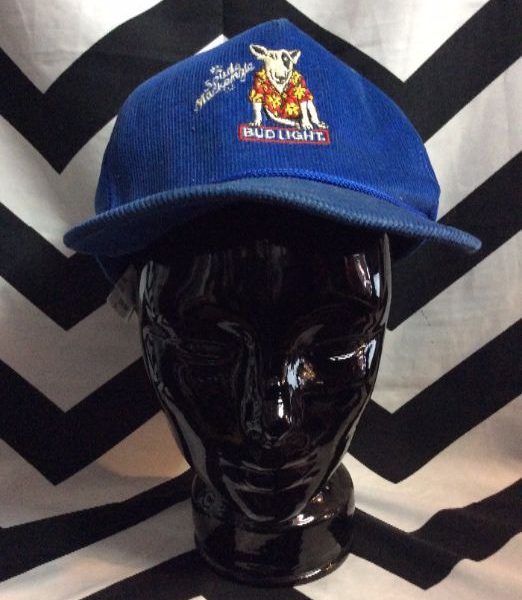 Retro Spuds MacKenzie baseball style hat, corduroy, embroidered design, blue as is