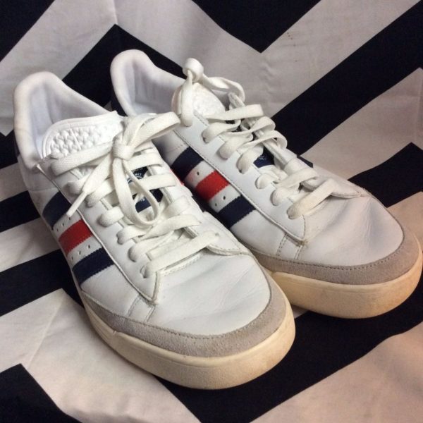 Retro Adidas tennis shoes, lace-up, stripes on sides, white/red/blue, size 11