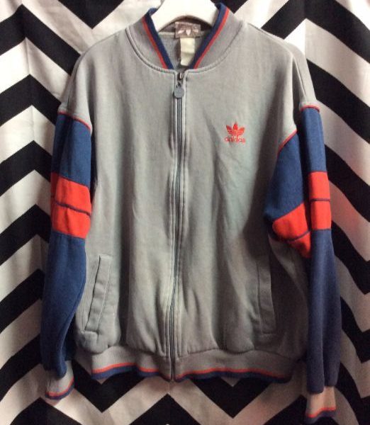 RETRO ADIDAS JACKET, TRACK STYLE, ZIP-UP, COTTON, TWO COLOR TRIM ON ARMS, GRAY/RED/NAVY, SIZE L