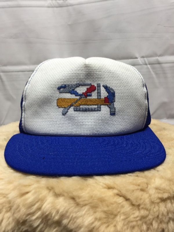 RETRO MESH TRUCKER HAT W/ ASSORTED TOOLS NEEDLEPOINT DESIGN