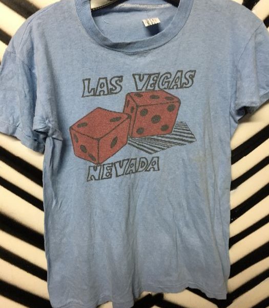 Retro Las Vegas, Nevada T-shirt, screen printed graphic, dice design on front, baby blue, size S small fit