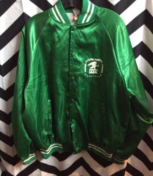 Retro USPS Postal Service satin baseball style jacket, button-up, screen printed design, green, size XL