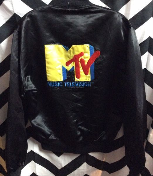 1980’s retro vintage, silk, MTV, applique & embroidered back design, black/yellow/red/blue, size S small fit