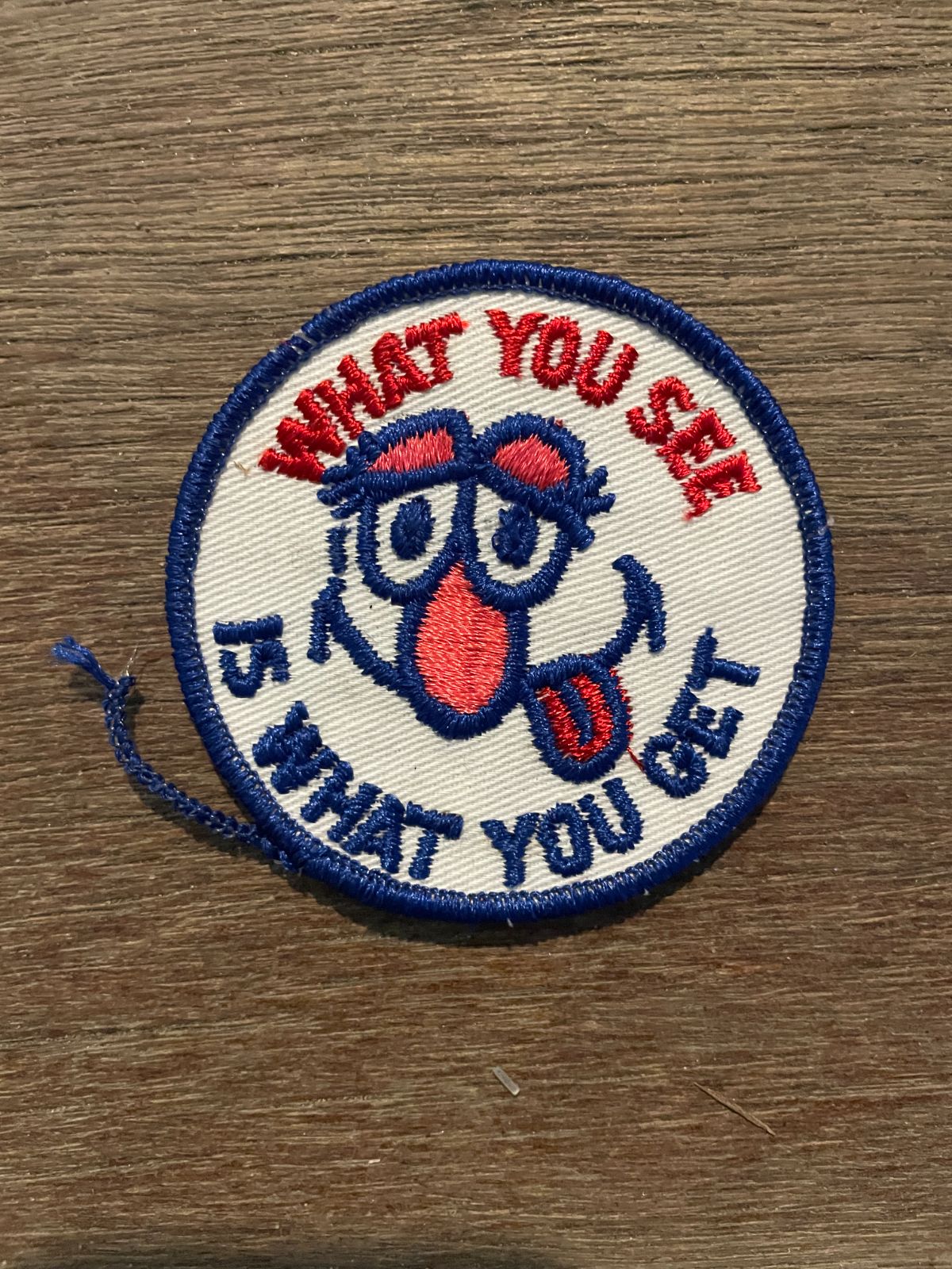 RETRO WHAT YOU SEE IS WHAT YOU GET SILLY FACE EMBROIDERED CIRCULAR PATCH