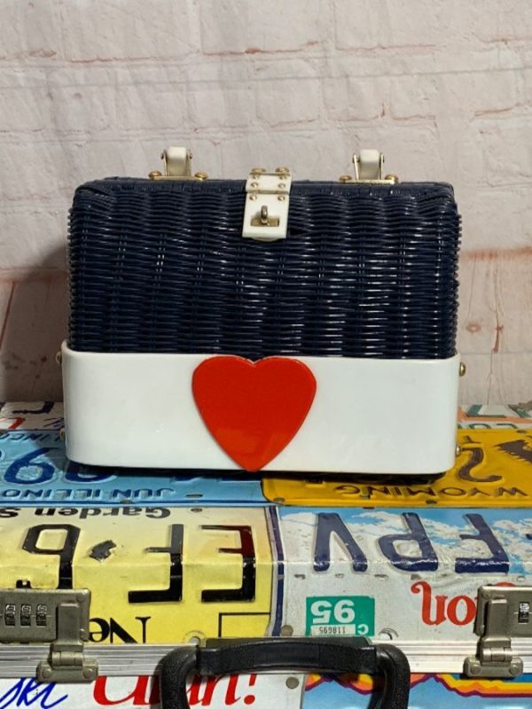 RETRO WICKER HAND BAG PURSE W/ LUCITE PLASTIC PARTS & ADDED HEART DESIGN
