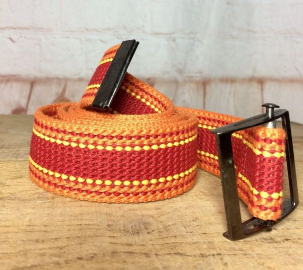 Retro belt, woven, multi-colored horizontal striped design, brass buckle, orange/red/yellow/brown