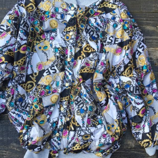 Bomber jacket, snap-up, reversible, sweatshirt lining, ornate Baroque chain design, gray/white/black/gold, size XL