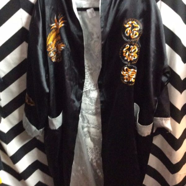 Kimono, long, reversible, embroidered dragon back design, black/silver/gold as is