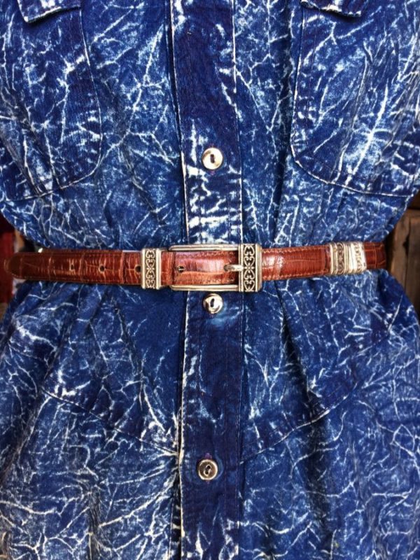 1990S BRIGHTON CROC EMBOSSED LEATHER BELT ORNATE CHERUB BUCKLE LOOP & TIP