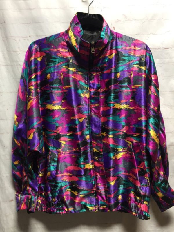1980’s jacket, silk, zip-up, reversible, crazy abstract print, black/purple/teal/rose, size M
