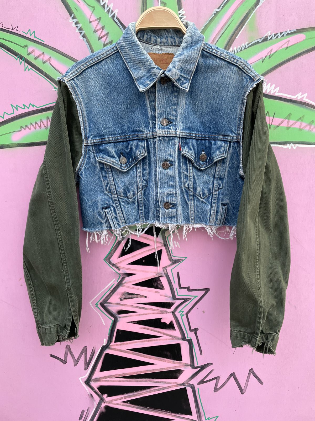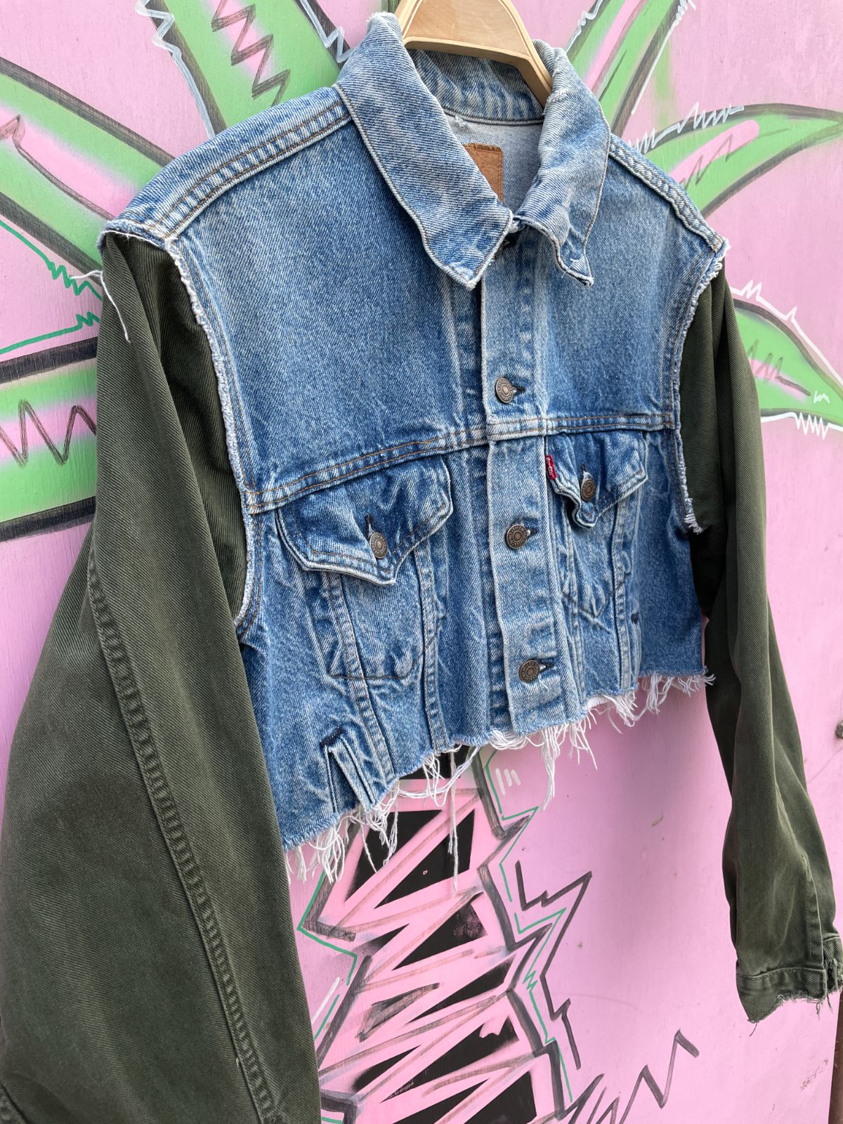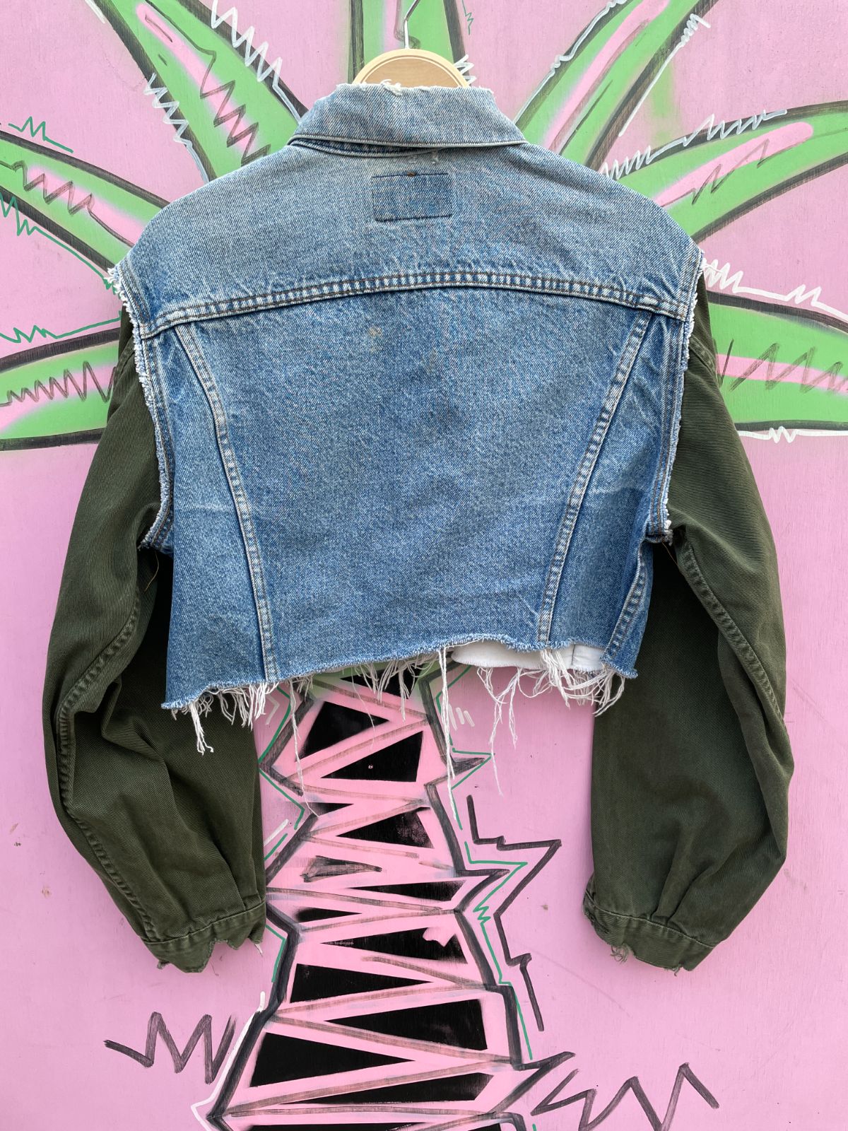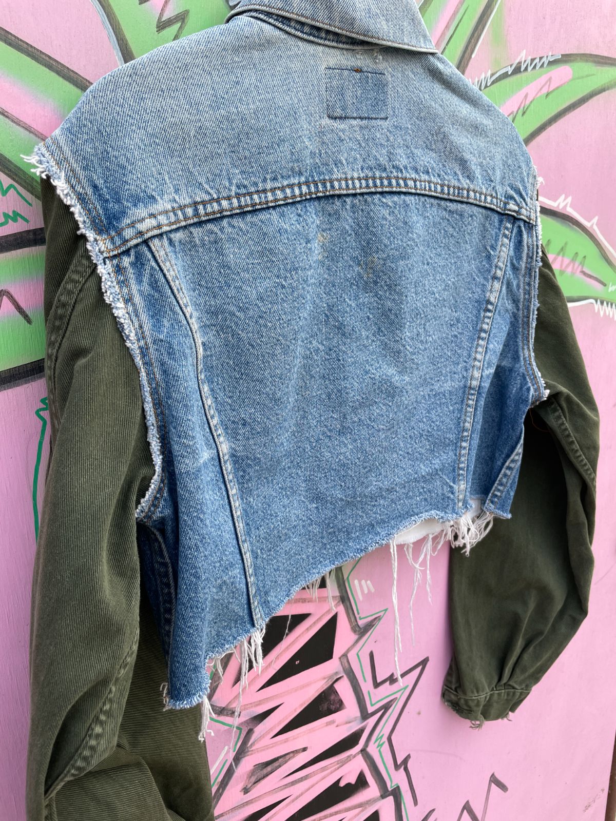 AS-IS REWORKED! CROPPED & DISTRESSED STONEWASH DENIM JACKET, OLIVE DENIM SLEEVES