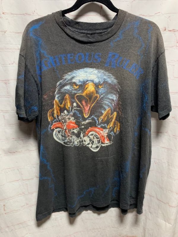 1994 3D Emblem T-shirt, Sturgis Black Hills Rally, Righteous Ruler, screen printed front eagle & motorcycle graphic with lettering & back buffalo skull grapic with lettering designs, faded, black/white/brown/red/gold/blue, size L