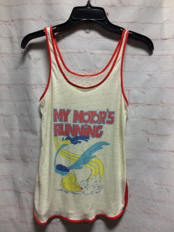 Tank top, contrasting trim on neck/arm holes/hem, paper-thin, Road Runner, My Motor’s Running, screen printed front graphic, white/red/yellow/blue, size S