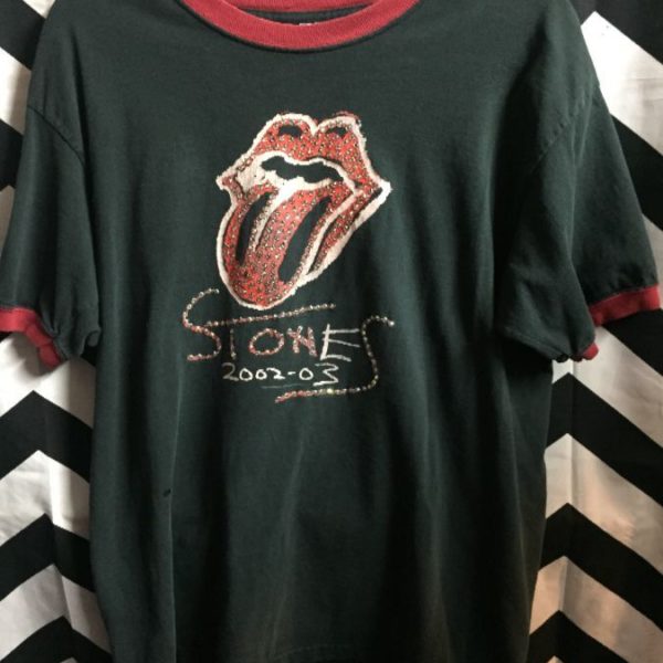 Custom 2002-3 T-shirt, ringed neck and sleeves, Rolling Stones Tongue design, screen printed front and back, embellished with Swarovski crystals, black/red/white, size L