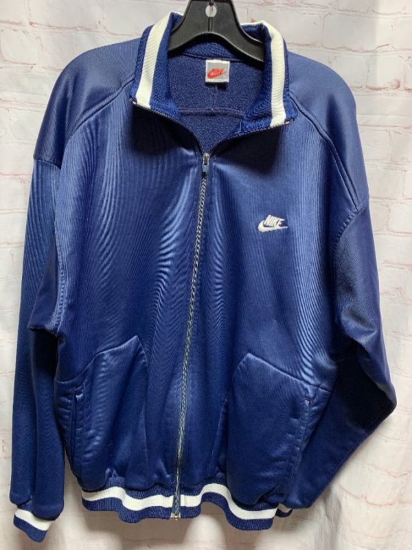 Nike running jacket, polyester, zip-up, gray tag, striped trim on collar/sleeves/hem, embroidered left chest logo, 2 front pockets, navy blue/white, size XL