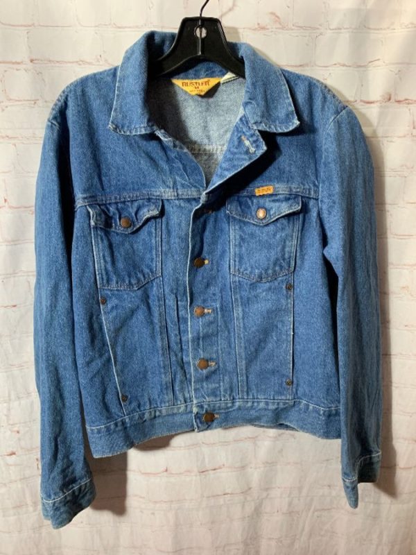 Rustler Western denim jacket, cotton, button-up, 2 front button-up pockets, adjustable back waist, medium blue, size M small fit
