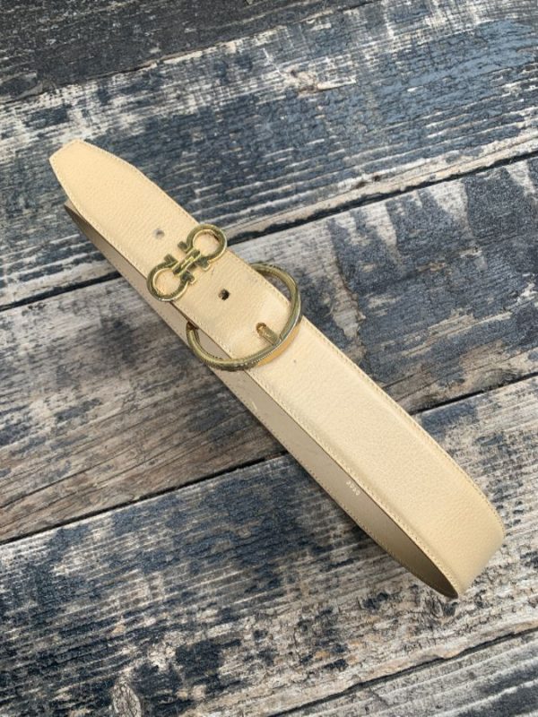 SALVATORE FERRAGAMO BELT, LEATHER, MADE IN ITALY, GOLD METAL POLISHED HARDWARE, BEIGE/GOLD, SIZE S