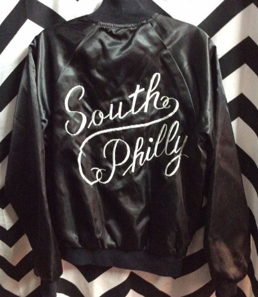 BASEBALL JACKET – SATIN – 8 BALL PATCH – SOUTH PHILLY LETTERING ACROSS BACK
