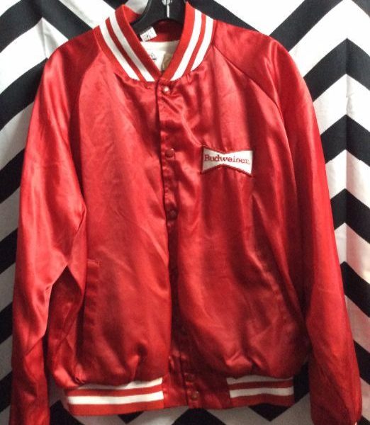 Budweiser baseball style jacket, satin, button-up, applique patches front & full back, red/white, size XL