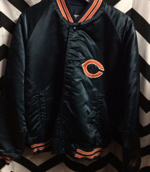 Chalkline baseball style jacket, satin, Chicago Bears, appliqued letters across back, dark blue/orange, size L