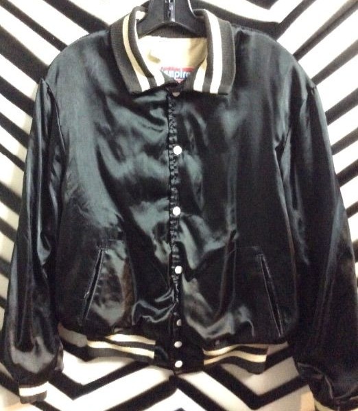 Tropea satin baseball style jacket, button-up, full back screen print design, black/white, size L