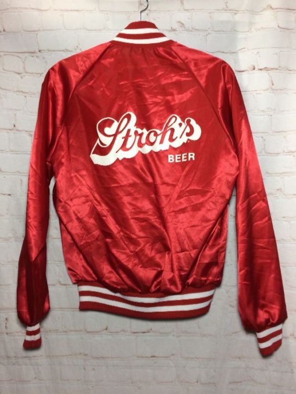 Swingster baseball jacket, satin, button-up with snaps, striped trim on neck/cuffs/hem, Stroh’s beer, screen printed lettering front chest & full back design, embroidered Goettler Dist., red/white, size S