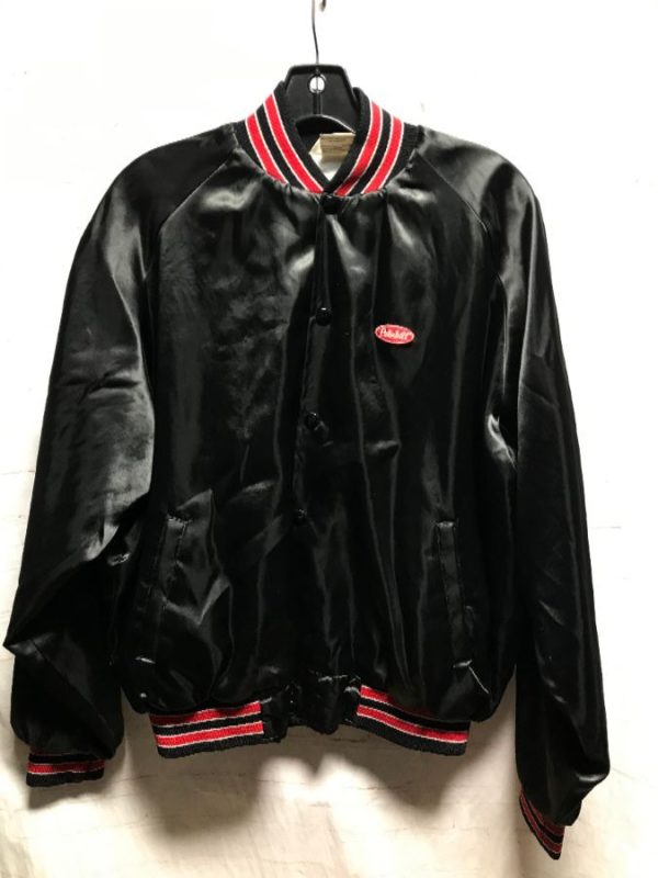 Tonkin Wearables bomber jacket, satin, button-up with snaps, striped collar/cuffs/hem, embroidered small logo & large back logo & big rig truck, black/red/silver/white, size L