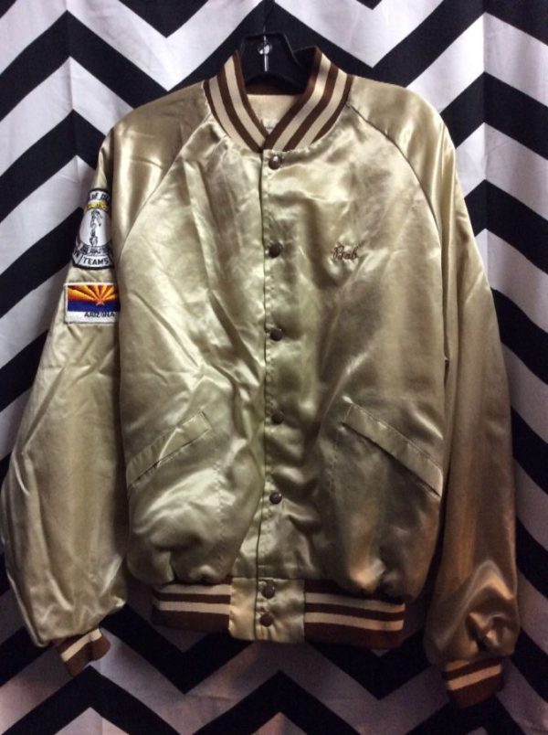 Bomber jacket, satin, button-up, screen printed back cowboy design with Southwest Stunts & The Longriders lettering, embroidered patches on sleeves, Bob embroidered on left chest, creme gold/brown, size L