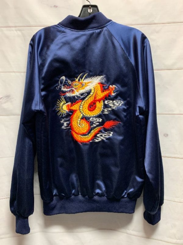 BOMBER JACKET, SATIN, ZIP-UP, EMBROIDERED DRAGON DESIGN FULL BACK, NAVY/MULTI, SIZE L
