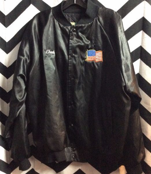United States Army bomber jacket, satin, button-up, back and chest patches, black, size XL