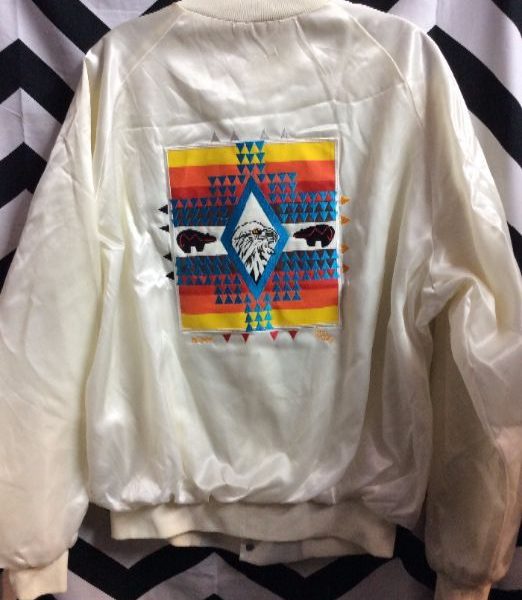 Baseball style jacket, satin, button-up, embroidered Navajo pattern, white/multi, size XL