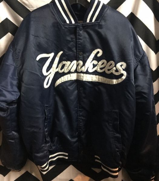 Majestic baseball style jacket, satin, button-up, New York Yankees, appliqued lettering, navy/white, size XL as is