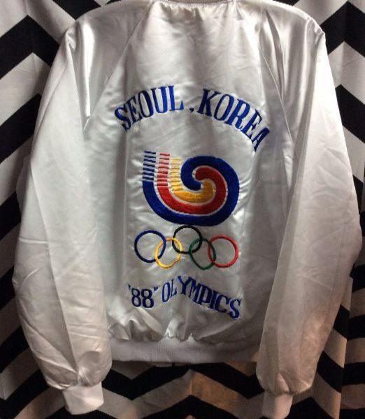 1988 bomber jacket, satin, zip-up, Invaders, John 3:16, Olympics in Seoul-Korea, embroidered designs front chest & full back, white/multi, size L