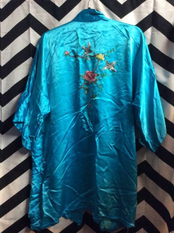SATIN KIMONO ROBE W/ EMBROIDERED FLOWERS & BIRDS DESIGN