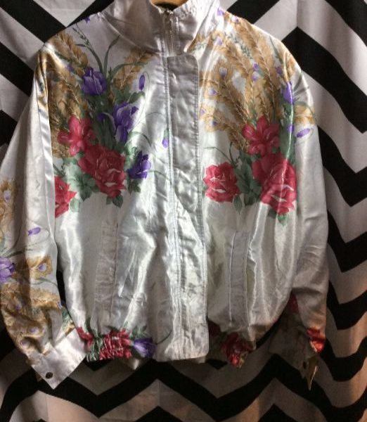 Windbreaker jacket, satin, reversible, floral design, white/multi, size M