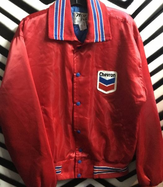 Chevron satin jacket, button-up, company patch, red/blue, size M