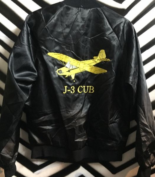 J-3 Cub baseball style jacket, satin, button-up, embroidered jacket back, black/yellow, size L