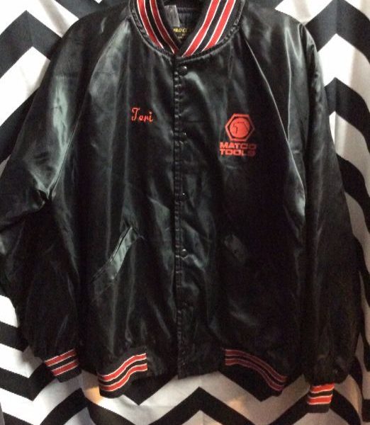BOMBER JACKET, SATIN, BUTTON-UP, MATCO TOOLS, SCREEN PRINTED DESIGN FRONT CHEST & FULL BACK, BLACK/RED/WHITE, SIZE L