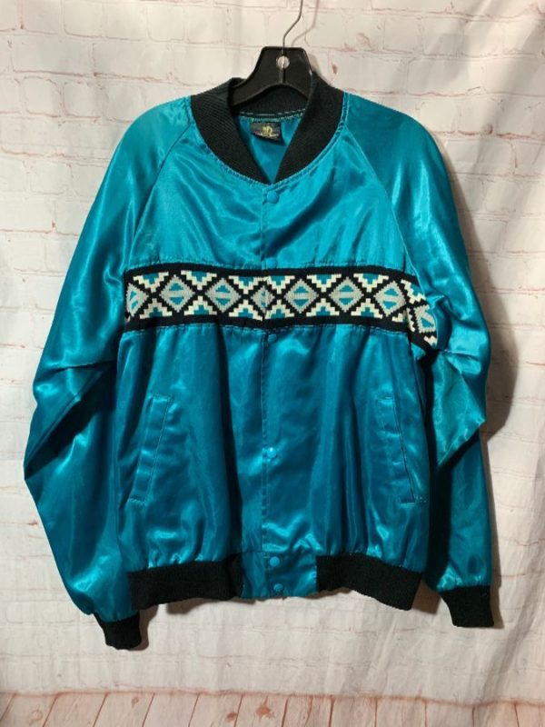 Black Sheep jacket, satin, button-up with snaps, knit collar/cuffs/hem, knit South-Western Aztec design in a thin horizontal strip, 2 front pockets, dead-stock, teal/black/white, size L
