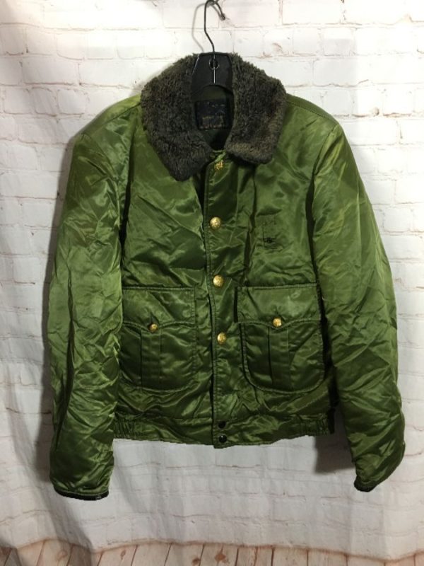 SATIN MILITARY BOMBER JACKET W/ FAUX FUR COLLAR & GOLD METAL BUTTONS